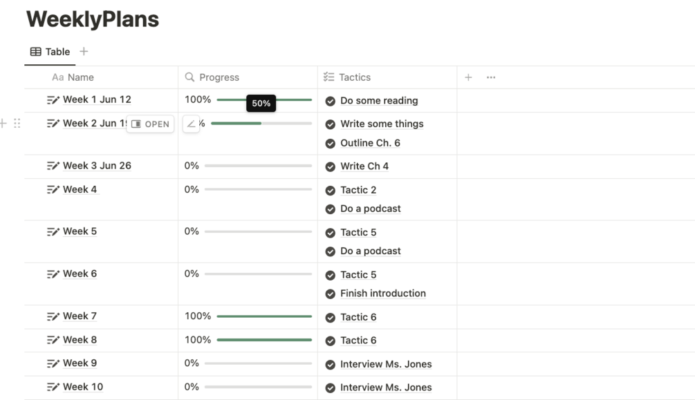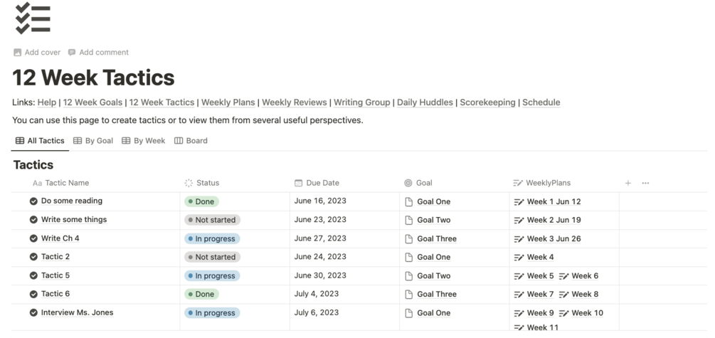 The heart of the template is the 12 Week Plan Dashboard. Predefined planning templates and automations make it easier than ever to set goals, assign tactics to weeks, and map our your 12 Week Plan. With tools for managing your Daily Huddles, Weekly Reviews, keeping track of your weekly execution, and Weekly Writing Group meetings, Get Your Writing Done for Notion will keep you on top of your writing.