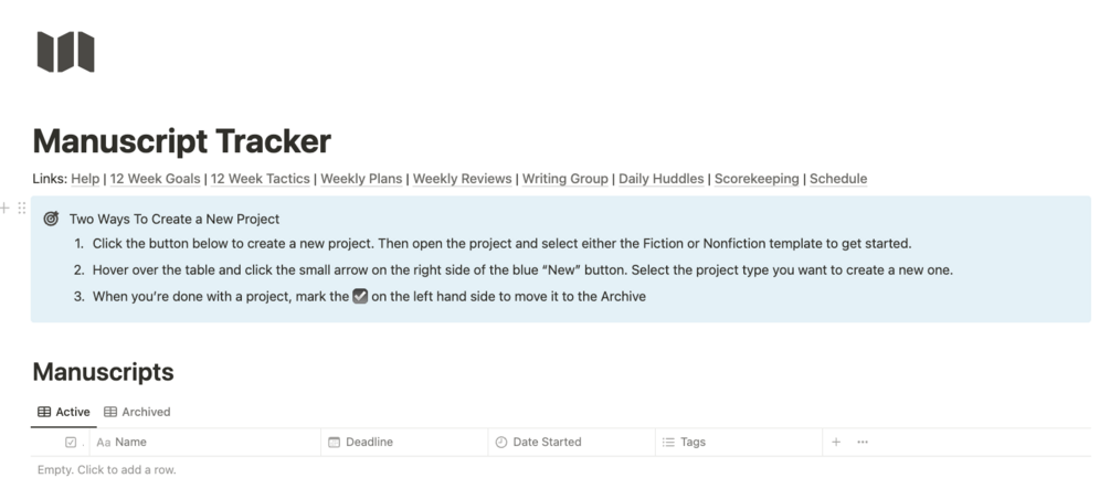 I'm the author of The 12 Week Year for Writers, a writing-specific version of the New York Times bestselling 12 Week Year productivity system. I built this template after years of using all kinds of other tools that just didn't do what I needed to implement the 12 Week Year.